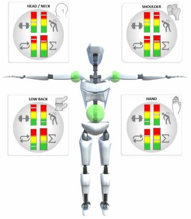 The selection, position and size of the parameter boxes is variable and can be adapted to the respective work and load-specific requirements. Up to four individual configurations can be saved as a template. The parameters are evaluated according to the traffic light scheme on the basis of the currently valid DGUV guidelines (DGUV Information 208-033).